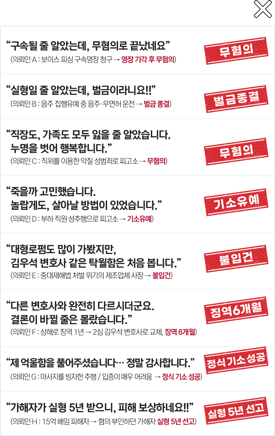 100% 김우석 변호사 직접 상담 (실무 직접 총괄)