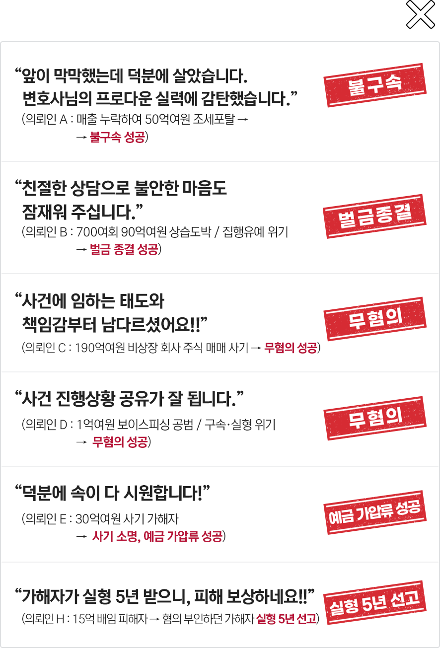 | ※ | 의뢰인의 프라이버시(privacy)와 우리 법인의 업무 노하우 보호를 위해, 구체적인 성공사례 내용과 변론 기법은 공개하지 않습니다. |